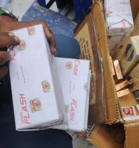 रेड के दौरान दुकान एवं गोदाम से नकली सिगरेट के विभिन्न ब्रांडों के बड़ी मात्रा में पैकेट जब्त किए गए, जिनमें नकली गोल्ड विमल पैकेट 920 डिब्बा, गोल्ड फ्लैक किंग 111 डिब्बे, गोल्ड फ्लैक किंग 96 डिब्बा, व्हाइट फ्लेक्स 274 डिब्बा, गोल्ड किंग 4 डिब्बे, गोल किंग 307 नग खुला को जप्त किया गया इन उत्पादों के असली उत्पादों की कुल 61,310 रुपए बताया जा रहा है जिसकी जप्ती की गई है । *आरोपित लक्ष्मण दास जय सिंह पिता किशन चंद जय सिंह उम्र 52 वर्ष निवासी 350/2 चक्रधरनगर सिंधी कॉलोनी पक्की खोली थाना चक्रधरनगर जिला रायगढ़* के विरूद्ध पर्याप्त साक्ष्य पाये जाने पर थाना चक्रधरनगर में *अपराध क्रमांक 161/2026 धारा 318(1), 349 बीएनएस, ट्रेडमार्क अधिनियम 1999 की धारा 103, 104 एवं कॉपीराइट अधिनियम 1957 की धारा 63, 64* के तहत अपराध पंजीबद्ध कर गिरफ्तार किया गया है तथा न्यायिक रिमांड पर भेजा गया है। उल्लेखनीय है कि जिले में ट्रेडमार्क अधिनियम के तहत यह पहली बड़ी कार्रवाई है।