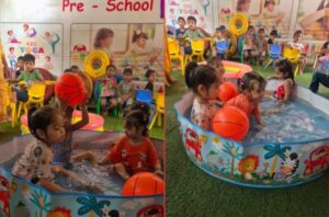 पूल पार्टी के दौरान पानी से लबालब भरे पूल में जब रंग-बिरंगी फुटबॉल और छोटी-छोटी कलरफुल गेंदें तैरने लगीं, तो बच्चों की खुशी का ठिकाना नहीं रहा। बॉल्स को पकड़ने के लिए बच्चे पानी में छपाक से कूद रहे थे और एक-दूसरे की ओर गेंद उछालकर ठहाके लगा रहे थे। कोई बच्चा अपनी ‘स्विमिंग रिंग’ के सहारे फुटबॉल को किक मारने की कोशिश कर रहा था, तो कोई अपने छोटे हाथों से साथियों पर पानी की फुहारें उड़ाकर उन्हें भिगोने के खेल में मगन था। इन बेफिक्र अठखेलियों से स्कूल का कोना-कोना बच्चों की मुस्कान से गुलजार हो उठा।